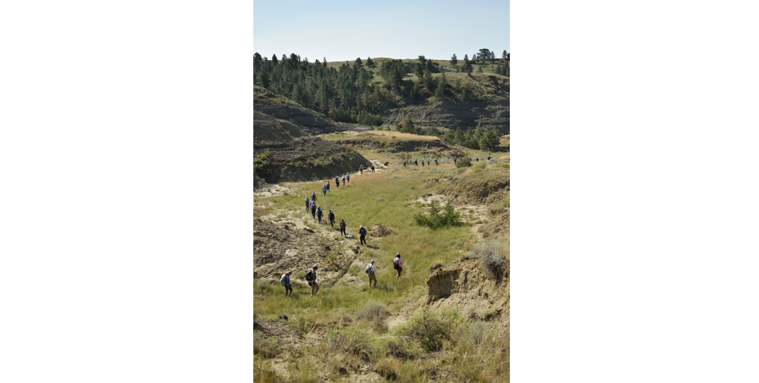 Participants had the opportunity to synthesize what they learned and immerse themselves in the work of paleontologists. Working in small groups, participants navigated to sites using GPS coordinates and then determined the best approach to surface collect fossils at their respective sites. They made observations and gathered data on their site’s geological formation to determine the approximate chronology of their location. Participants were able to see and study the K-Pg Boundary (pictured below) — the before and after of non-avian dinosaurs!
